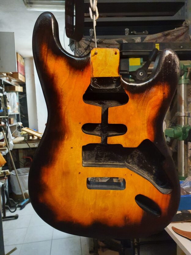 Descrizione body in ciliegio tavola unica manico in acero tastiera in palissandro 21 tasti scalatura Fender Tasti medium jumbo Due pick-up Celentano un volume selettore 3 posizioni Meccaniche autobloccanti Ponte Fender style Sunburst body IGL TM burned