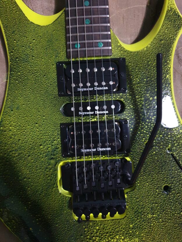 Descrizione corpo in tiglio manico in acero tastiera in palissandro 24 tasti scalatura Gibson 3 pick-up Seymour Duncan Tasti jumbo volume , tono push-pull selettore 5 posizioni Meccaniche Ibanez Ponte Floyd Rose Drop paint IGL TM